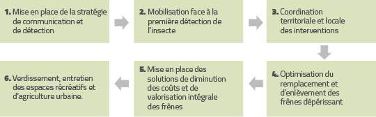 Notre démarche d’intervention pour de l’agrile du frêne met en évidence les axes stratégiques de prévention, de communication, d’action et de gestion planifiée de l’épidémie.