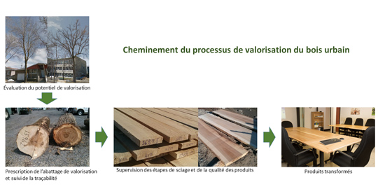 Transformation des résidus d’abattage d’arbre urbain en table de conférence et en relique artistique. Le processus de valorisation que nous avons mis en place dans le cadre de ce projet, consiste en une multitude d’étapes bien définies afin d’obtenir un résultat concret. Ces dernières sont effectuées sur la base d’indicateurs clairs qui permettent à tout moment de faire le meilleur choix pour minimiser les coûts d’opérations et de garder un standard élevé de qualité. Afin de réaliser le mandat, IAER Solutions a collaboré avec plusieurs intervenants tant au niveau des arboriculteurs pour l’abattage qu’au niveau des entreprises d’ébénisterie pour la confection des tables. Le processus entier s’est mis en place sous la supervision de l’équipe du projet composé des membres de l’administration de la Ville ainsi que les membres de l’entreprise. Le projet a été complété durant le mois de janvier 2015 suite à l’aménagement des salles de conférence ainsi qu’à l’installation des reliques artistiques. Voici le processus global que le bois a suivi afin de se rendre au résultat final installé dans les deux salles de conférence des bureaux de la ville de Québec :